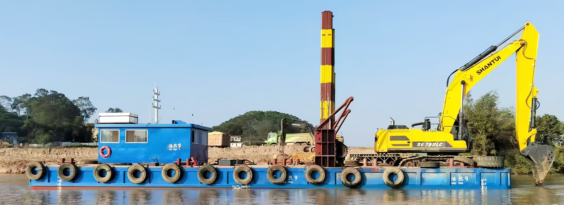 2、施工平臺穩(wěn)性強,方便挖掘機在深水區(qū)施工作業(yè)。并且,平臺自帶航行動力,便于水上調遣。